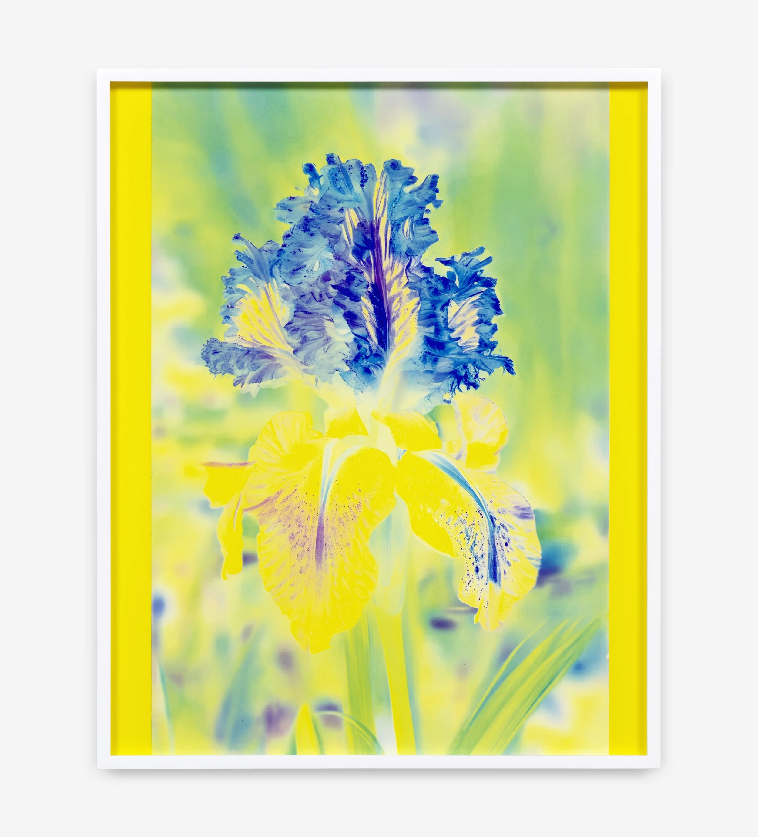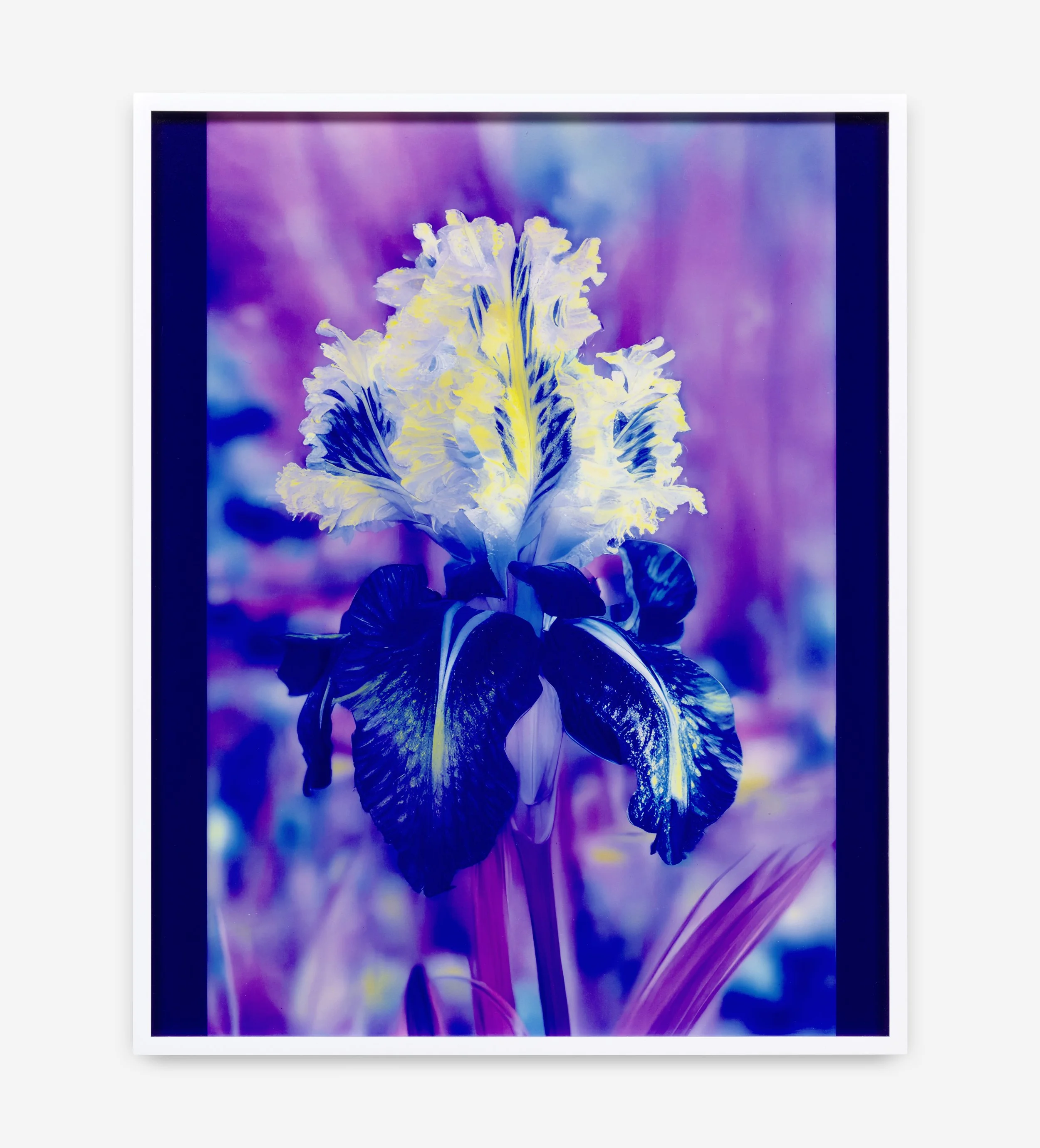 Croisant Dye Transfer, procédé utilisé par Steichen lors de ses expérimentations dans les années 1930-1940, et l’intelligence artificielle, Oppenheim redonne vie à un iris aujourd’hui disparu baptisé Monsieur Steichen, créé en 1910 par le botaniste Fernand Denis. Elle emploie l’IA pour générer des «hybrides hypothétiques » fusionnant les images des deux variétés d’iris originelles. Les images ainsi générées sont ensuite transformées par Dye Transfer, utilisant l’imprégnation successive de colorants cyan, magenta et jaune pour perturber la vraisemblance, tant génétique que photographique.